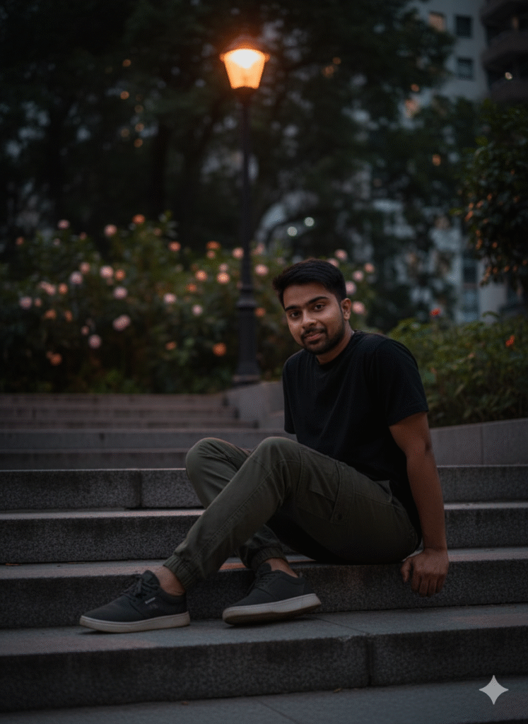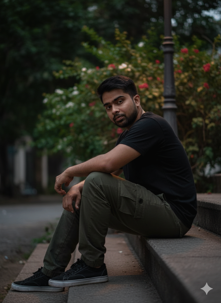 "Create 8k Cinematic, dark and moody photo of me sitting on urban concrete steps at dusk. The camera angle is slightly from the side. He is wearing a t-shirt, cargo pants, and sneakers, looking directly into the camera with an extremely confident and self-assured expression. His face is in clear, sharp focus, highlighting his features. One leg is bent, with his foot resting on a higher step in a relaxed pose. Behind him, a single lamppost casts a soft, warm glow. The background is subtly blurred (bokeh effect), featuring out-of-focus flowering plants and trees, adding depth and a touch of nature to the urban setting. The overall lighting is dim and shadowy, capturing the quintessential feel of a dramatic city evening. Ultra-realistic, detailed, sharp focus on the subject's face."
