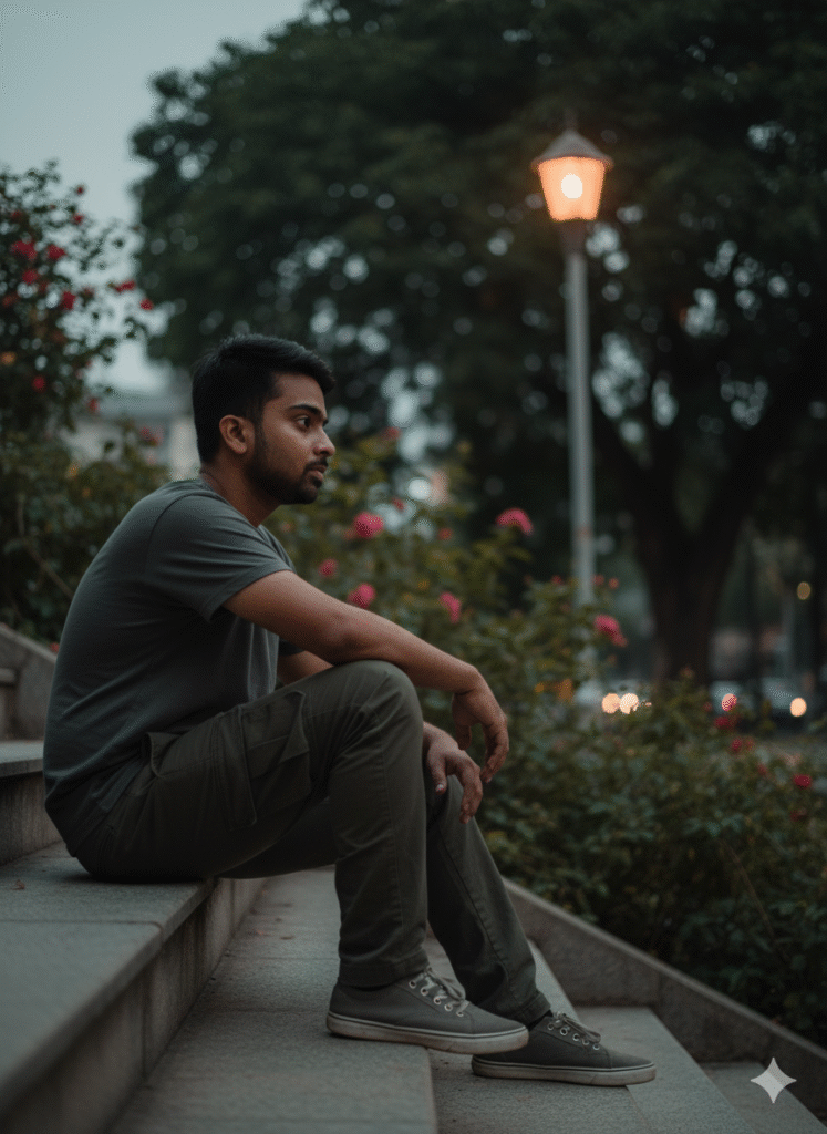 An ultra-realistic, 8K cinematic photo featuring a young man seated on concrete urban steps at dusk. Captured from a slightly side angle, he wears a t-shirt, cargo pants, and sneakers, with one leg bent casually on a higher step. His sharp, clear face reflects a thoughtful, pensive expression as he gazes just off-camera. A single lamppost casts a soft, warm glow behind him, while the blurred bokeh background of trees and flowering plants enhances the depth and mood. The dim, shadowy lighting creates a dramatic city-evening atmosphere, with every detail in sharp focus for a powerful, contemplative portrait.